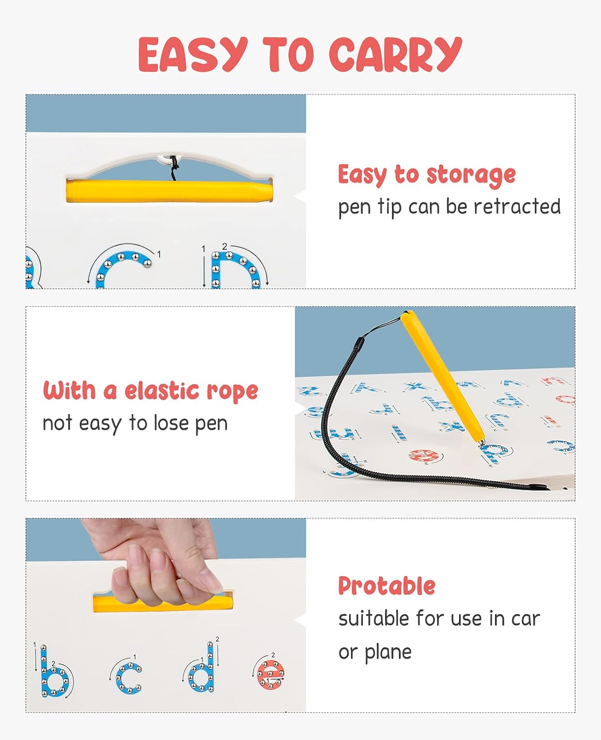 - Great Tool to Teach Writing: Children using the stylus pen help them stay on the stroke – and they love to hear and see the metal beads pop up as they go. Then they can use their finger to erase each letter. With the sequence stroke and path direction instruction guide next to each alphabet character